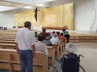 No final do almoço parou um pouco de chover e os técnicos levaram, nas carrinhas, os idosos até próximo da Igreja da Santíssima Trindade. Depois de visitarem este local o tempo melhorou e assim os utentes deslocaram-se para junto da compra de velas. Alguns compraram para que depois as pudessem queimar no devido local. Após este momento o grupo assistiu um pouco a uma missa que estava a decorrer.